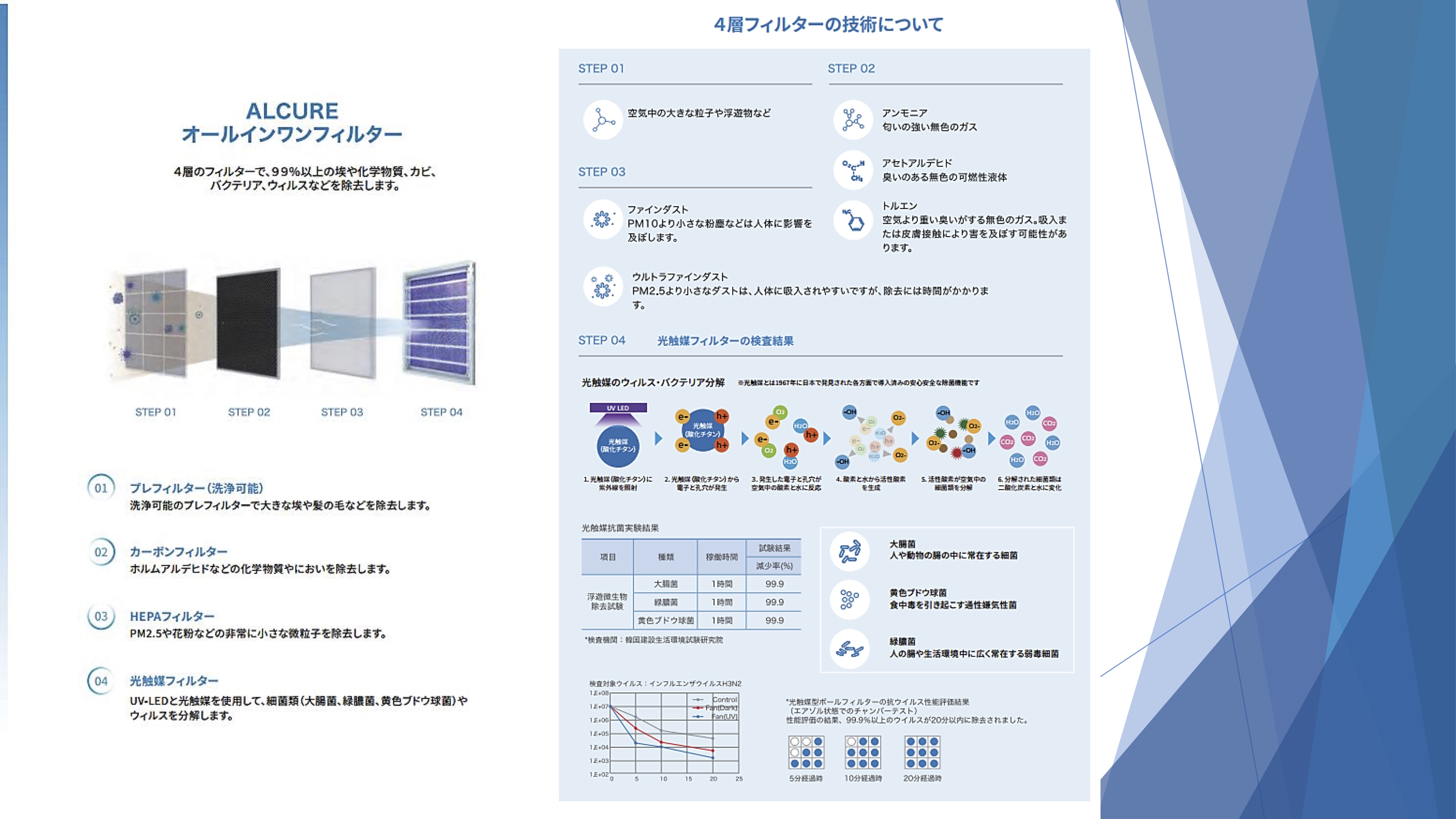 光触媒により浮遊ウイルスやバクテリアなどを強力分解。通常の空気清浄機では除去できないインフルエンザ菌やノロウイルス、COVID19も99%不活性化が実証されています。