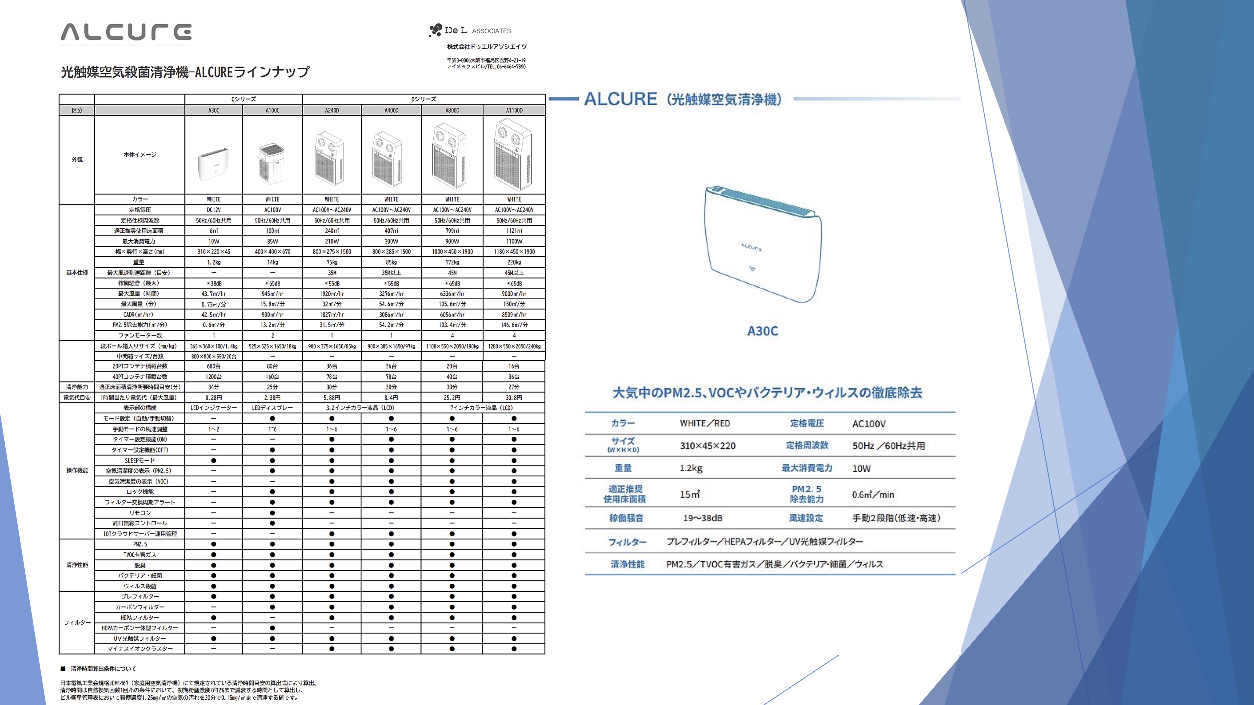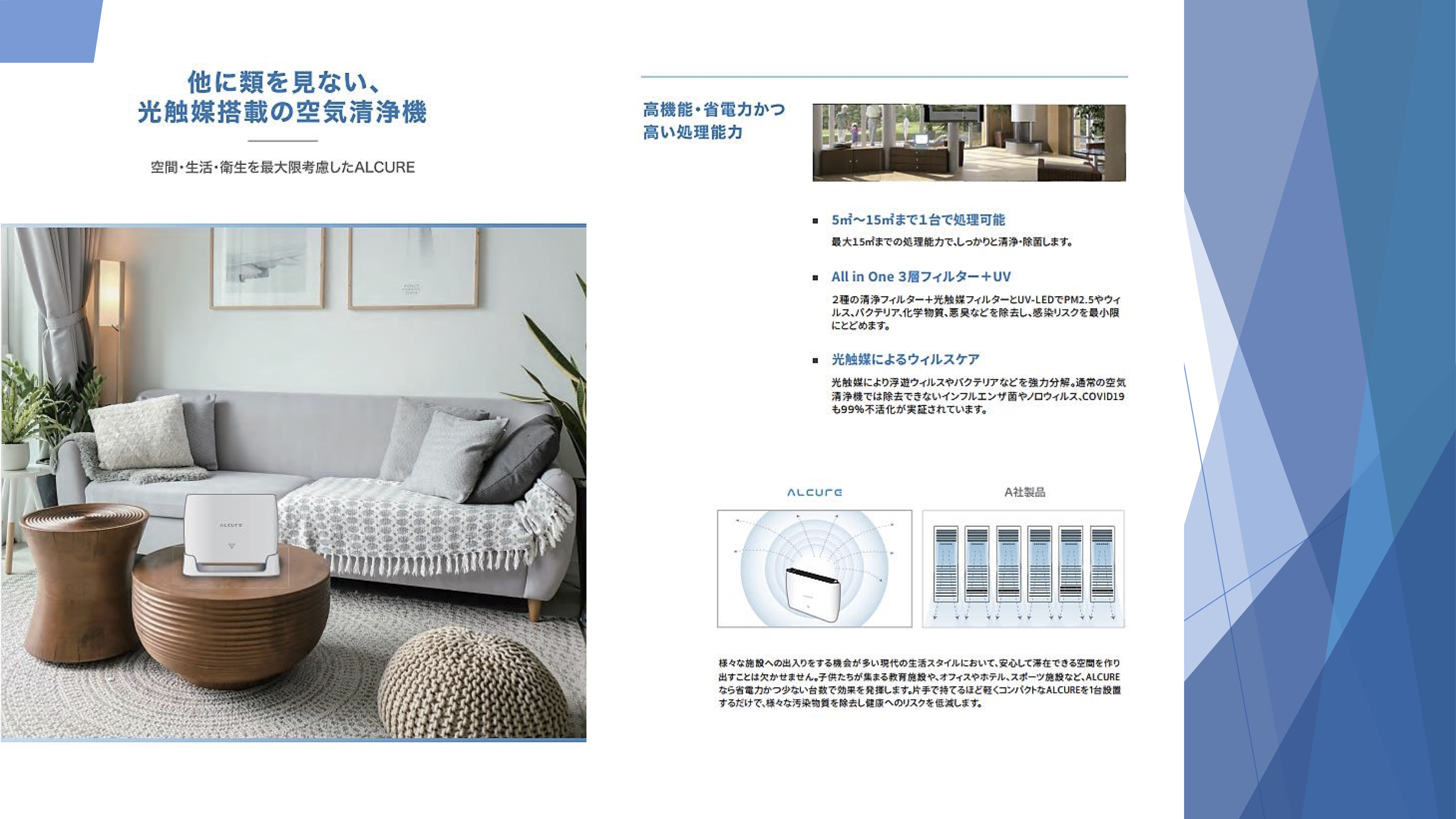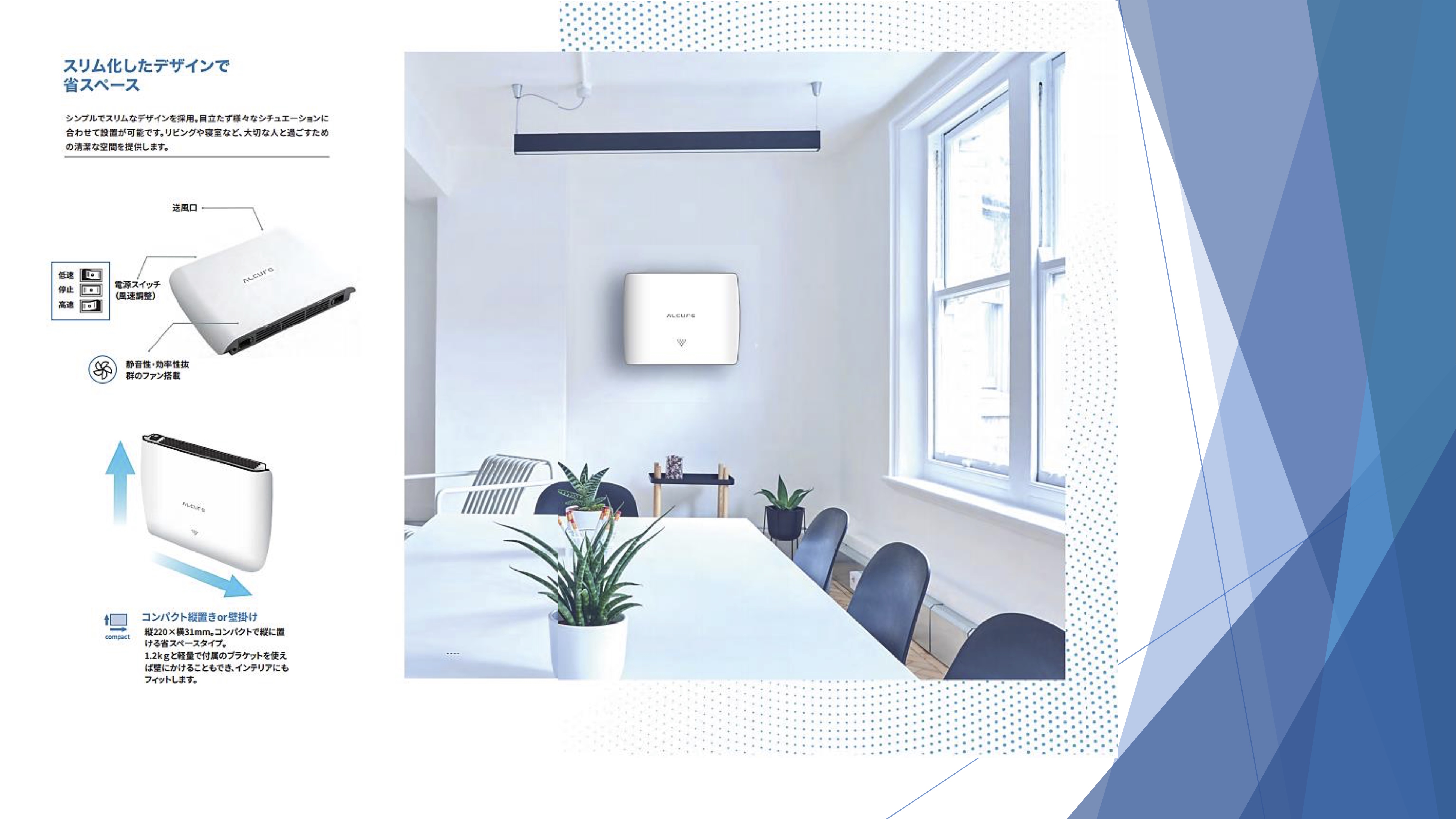 光触媒により浮遊ウイルスやバクテリアなどを強力分解。通常の空気清浄機では除去できないインフルエンザ菌やノロウイルス、COVID19も99%不活性化が実証されています。