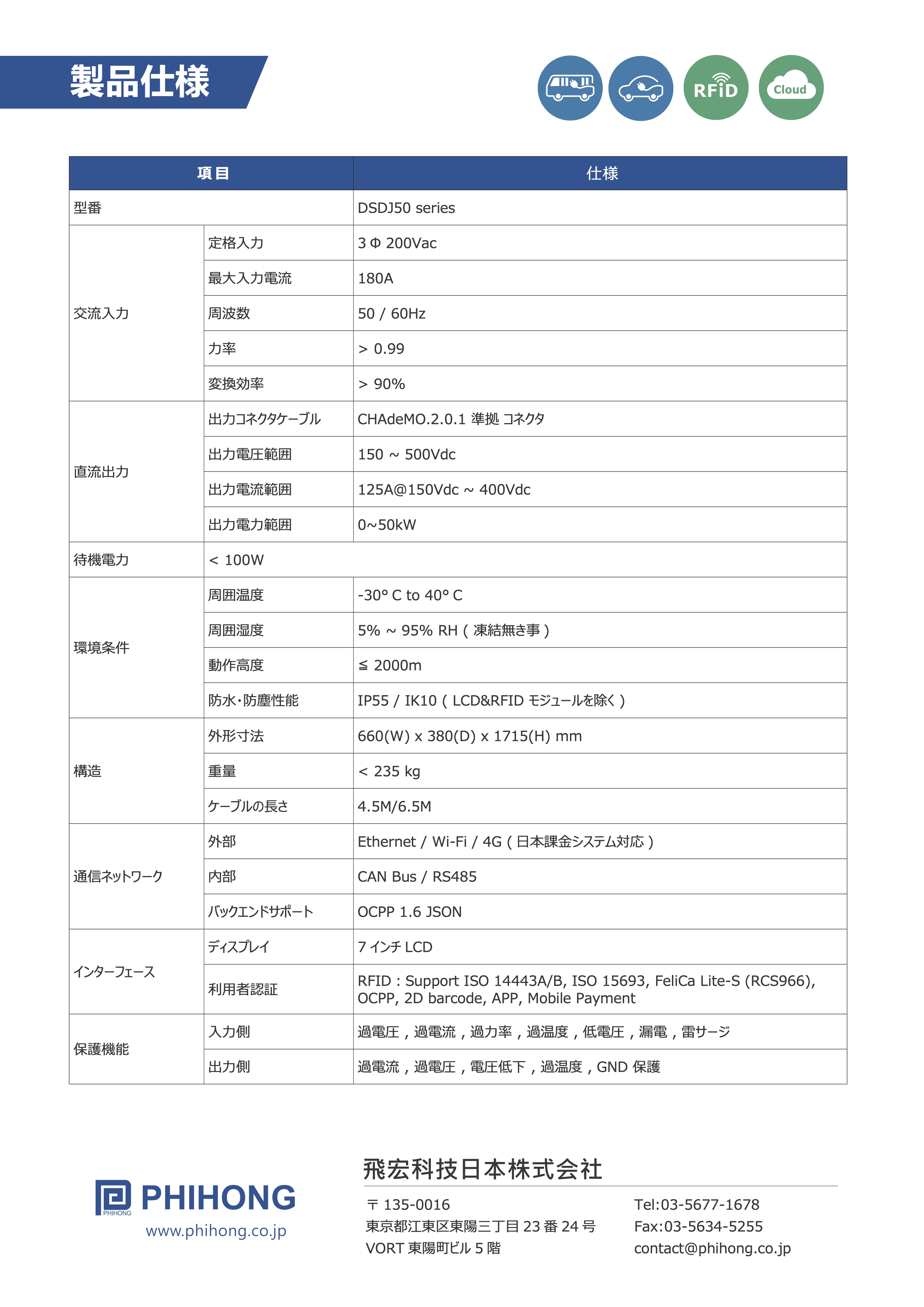 | 利用者認証 | RFID:Support ISO 14443A/B, ISO 15693, FeliCa Lite-S (RCS966),OCPP, 2D barcode, APP, Mobile Payment | |